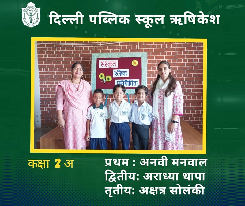 दिल्ली पब्लिक स्कूल ऋषिकेश में शुक्रवार, 9 अगस्त, 2024 और शनिवार,10 अगस्त, 2024 को संस्कृत श्लोक प्रतियोगिता का आयोजन किया गया| इस प्रतियोगिता में कक्षा प्री नर्सरी से कक्षा 5 तक के विद्यार्थियों ने प्रतिभाग किया। सभी प्रतिभागियों ने भगवत् गीता के श्लोकों का सस्वर तथा लयगति में वाचन किया तथा गीता का जीवन में महत्व भी बताया। प्रतियोगिता की शुरुआत स्वस्तिका बिष्ट ने गीता की महत्वता और संस्कृत भाषा की महत्वत्ता को बताते हुए की ।इस प्रतियोगिता का मुख्य उद्देश्य विद्यार्थियों की बौद्धिक क्षमता का विकास करना, कर्तव्यनिष्ठ बनाना और अपने आत्मविश्वास को बनाए रखना के लिए प्रोत्साहित करना है। श्लोकों के माध्यम से जीवन जीने के मूल्य, नीतियों तथा छात्रों के ज्ञान को प्रवीण करना है।इस श्लोक प्रतियोगिता में विद्यार्थियों ने बढ़ - चढ़कर प्रतिभाग किया ।